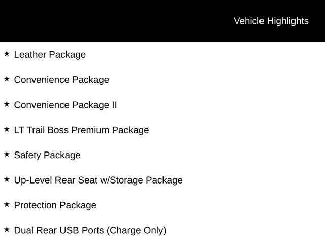 Discover the ultimate in capability, comfort, and style with this 2024 Chevrolet Silverado 1500 LT Trail Boss. This exceptional truck is ready to take on any adventure, whether you're tackling rugged terrain or navigating the daily commute.- 3.0L I6 Duramax Diesel Turbo Engine- 10-Speed Automatic Transmission- 4-Wheel Drive- 21 City / 23 Highway MPGeMeticulously equipped with a host of premium features, this Silverado LT Trail Boss is the perfect blend of capability and comfort:- LT Trail Boss Premium Package- Dark Essentials Package (LPO)- Leather-Appointed Seating- Power Sunroof- Bose Premium Audio System- Heated Steering Wheel- Adaptive Cruise Control- Bed View Camera- Integrated Trailer Brake Controller- In-Vehicle Trailering System App- Trailer Side Blind Zone Alert- Rear Cross Traffic Braking- Rear Pedestrian Alert- Ultrasonic Front & Rear Park AssistThis Silverado's impressive features don't stop there. Enjoy the convenience of keyless entry and start, dual-zone automatic climate control, and a power-sliding rear window. Stay connected with the Chevrolet Infotainment 3 Premium system, complete with SiriusXM, Bluetooth®, and wireless charging.Whether you're hauling heavy loads, towing your toys, or simply seeking a commanding presence on the road, this 2024 Chevrolet Silverado 1500 LT Trail Boss is the ultimate choice. Experience the perfect balance of capability, technology, and style. Schedule a test drive today and discover why this Silverado is the perfect companion for your next adventure.